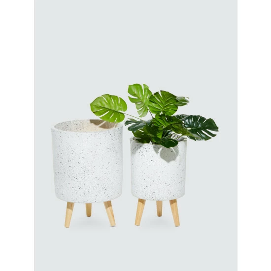 When filled with plants, this set of cylindrical planters brings tranquility to your space, promoting wellness and creating an immediate feeling of relaxation. These decorative planters are sure to add bundles of charm to your home. Beautifully detailed, they feature a light gray finish and three slanted legs for extra support. These planters are made of fiber clay, ceramic and wood. They’re ideal for outdoor use. Each piece can withstand all weather types.