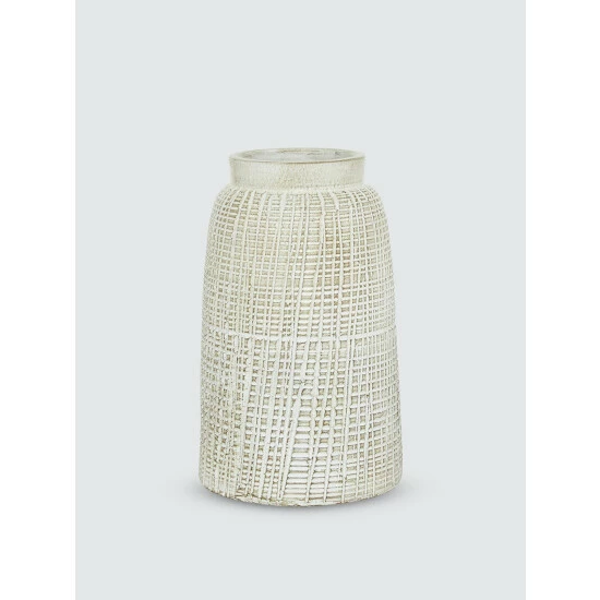 This bright, beautifully textured white vase features a tall cylinder silhouette with hand-etched crosshatch details throughout the body. The matte eggshell white glaze has a distressed finish to accentuate the texture and add depth. A wide mouth will hold several twigs, dried flowers or other vase decor. The neutral hues and ample size makes for a great accent piece on your foyer table, large dining table or living room.