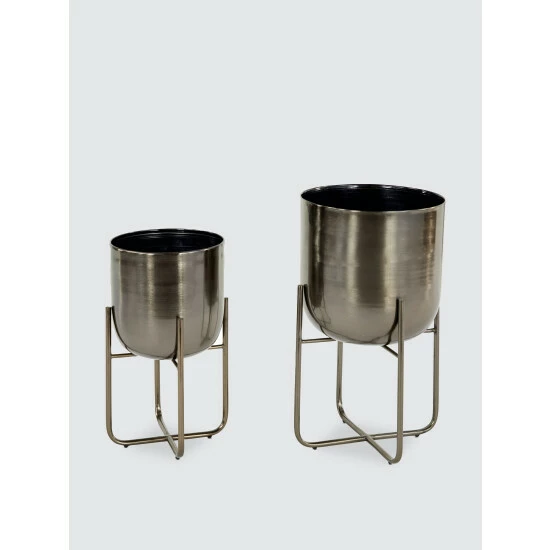 Add gilded shine and contemporary style to your space with this pair of metallic gold planters in gold metal stands. Solid iron construction means lightweight, durable, and safe from the elements when placed outside. Deep, round planter bodies will beautifully display an array of plants and the extra height from the elevated bases let your vines flow freely. Neutral yet stunning metallic gold finishes complement any pattern or color palette with a posh touch. Perfect to display in contemporary-inspired living room, bedroom, office, or even outdoor spaces like patio or garden. Rubber pads on the base provide stability, while protecting furniture and tabletops from scratches.