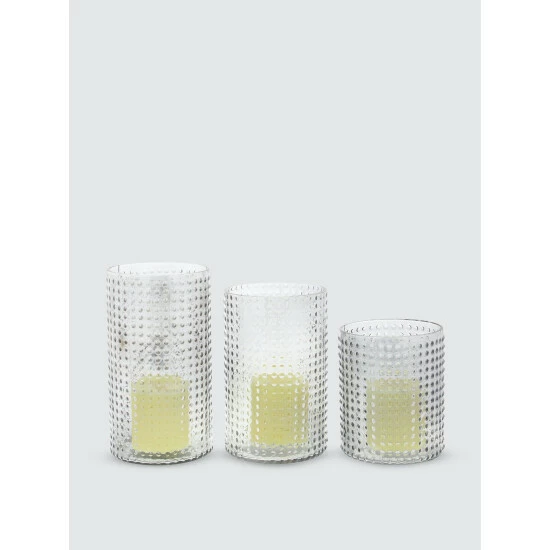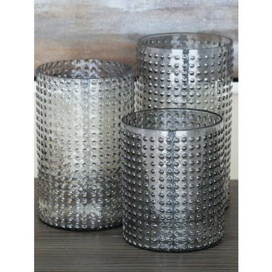 Votive candles placed inside this set of glass candleholders makes a striking arrangement. These pieces are not only useful for holding your candles, but also create an elegant vibe in your home. Cylindrical candleholders are made of frosted glass in varying heights. Each is embossed with dotted accents that impart beauty and elegance to your interior decoration. Rubber pads on the base provide stability, while protecting furniture and tabletops from scratches.
