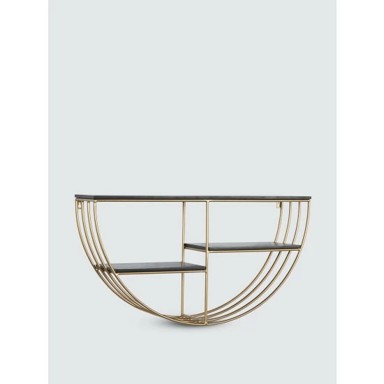 This half-circle, wall-mounted book rack plays with lines and shapes. It has three levels of racks that can hold figurines, mini sculptures, photo books, small potted plants and picture frames.