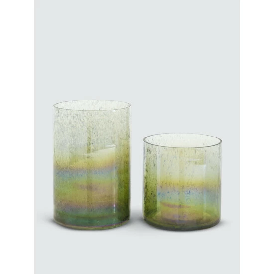 Add kaleidoscopic illumination to your space with this set of beautifully dimensional candleholders. Each is hand-blown and features a reflective, rainbow iridescence with a light green, transparent undertone. Use with your favorite pillar candles to enjoy the ambient light.