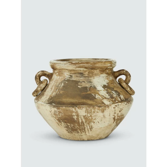 This handmade terracotta pottery features a wide rim for decorative orbs, pine cones or floral arrangements. You can also simply display it as a stand-alone piece of decor.