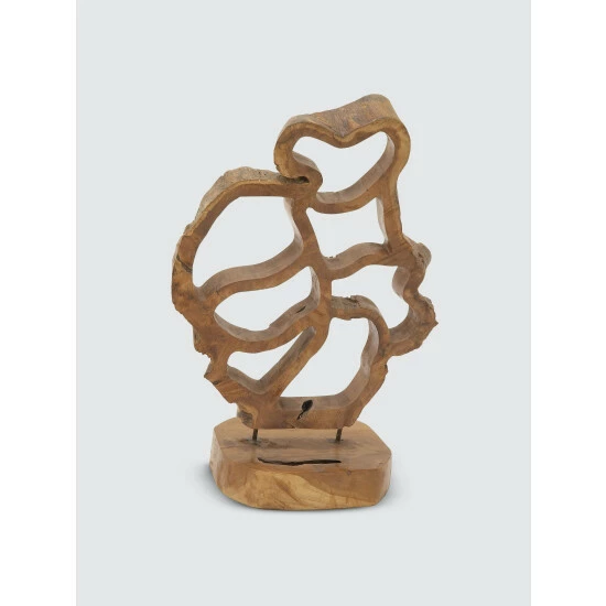 Displaying both eclectic and natural styles, this large teak wood sculpture features hand-carved solid teak wood with mocha and golden brown hues swimming throughout the vivacious natural wood grain. The sculpture is carved into an eclectic design with a wavy, rounded silhouette and cutouts throughout the center. Two sturdy black iron rods secure the wood art to the solid teak base with an irregular carved shape to keep consistent with the natural movement of the raw wood. Make a bold statement on your counters and consoles with this natural-themed sculpture. Rubber pads on the base provide stability, while protecting furniture and tabletops from scratches.