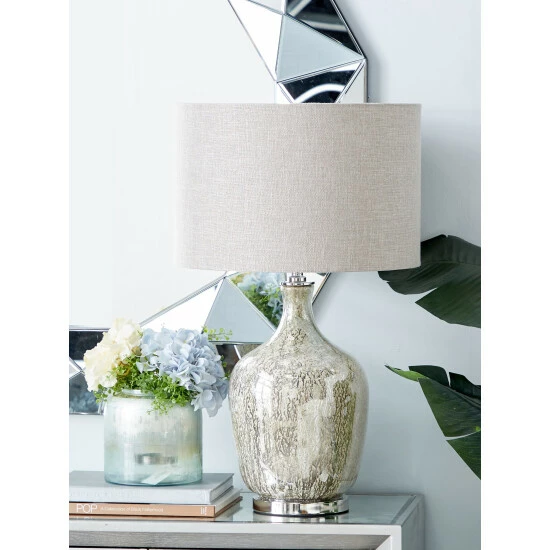 Create a warm atmosphere for you and your guests with this chic table lamp. It features a shiny glass base topped by a drum shade. You can place it on your mantle, console table or nightstand and it will brighten up any room.