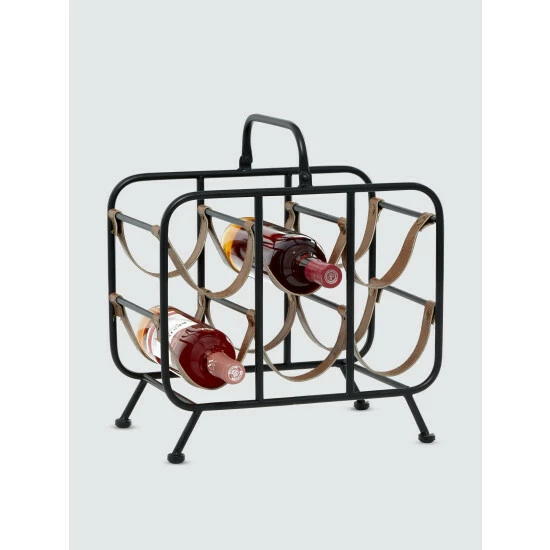 This metal and leather, six-bottle wine holder brings vintage-meets-modern vibes to your home.The metal frame supports two tiers of natural leather straps, holding up to six bottles. Place on an indoor or outdoor table. Rubber pads on the base provide stability, while protecting furniture and tabletops from scratches. Suitable for indoor use only.
