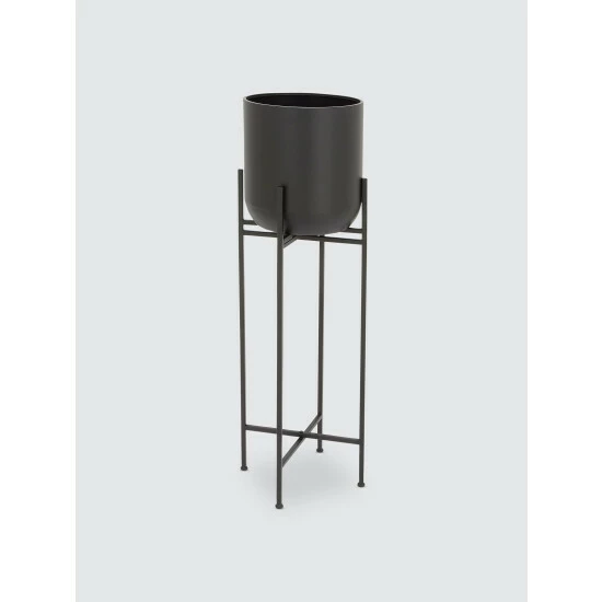 Simple design with a monochrome black finish, this modern planter stand features a large, bucket-shaped round planter top secured in a tall metal plant stand with an X-shaped base. The solid iron construction means this black planter is sturdy, lightweight and suitable for both indoor and outdoor use. Indoor and outdoor planter with modern style for your deck, patio or front door and indoors as accent decor in your living room, bathroom or bedroom.