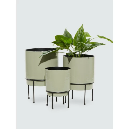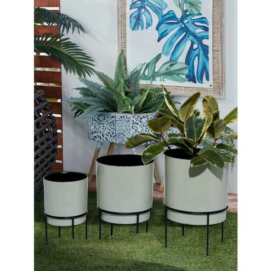 Add contemporary style to your space with this trio of planters. Solid iron construction means the planters are lightweight, durable and safe from the elements when placed outside. Deep, cylindrical bodies will beautifully display an array of plants and the extra height from the elevated tripod bases let your vines flow freely. Rubber pads on the legs provide stability, while protecting furniture and tabletops from scratches. A neutral yet stunning finish complements any pattern or color palette.