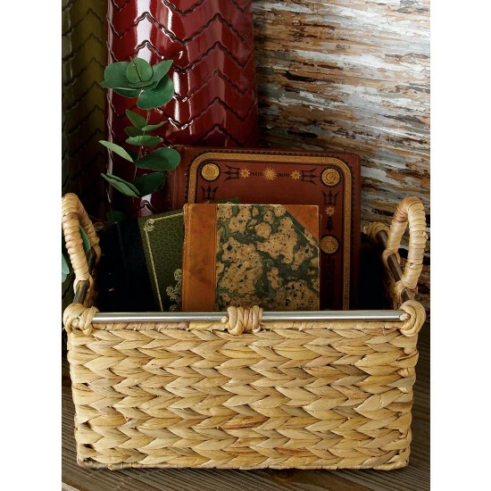 Beautifully handmade, with an open herringbone weave, this set of medium-size, rectangular, naturally colored seagrass baskets gives you plenty of stylish storage. The body of each basket is handmade from seagrass cords woven through a hard frame, creating a unique textural design. Each basket is easy to carry, with two rectangular cutouts forming handles. The polished, silver metal rims, woven in place with rattan rope, add modern flair to these decorative and practical storage baskets.