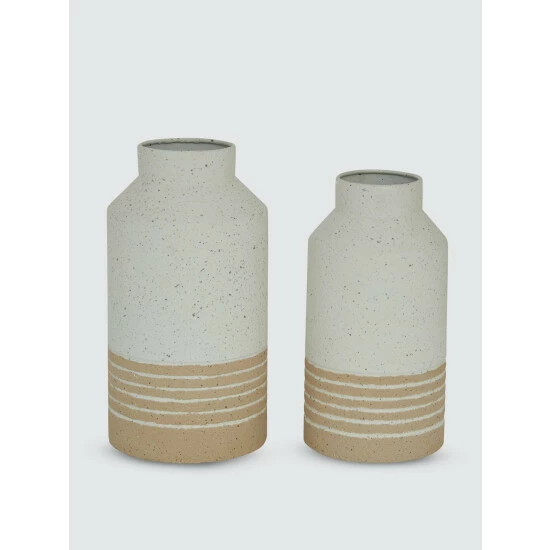 Pair these metal cylinders together or display them separately to provide your home with both style and function. They work as vases and as tabletop decor for country-chic and farmhouse interiors. The bodies are iron painted to mimic a ceramic finish.