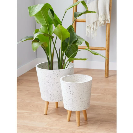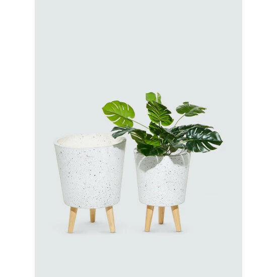 Incorporate some greenery into your living space with this cone-shaped, marble-like, fiber clay set of two planters. The fiber clay construction provides durability without sacrificing beauty and elegance. The planters rest on wooden tripod legs. This planter set will bring much-needed freshness to your chic living space.