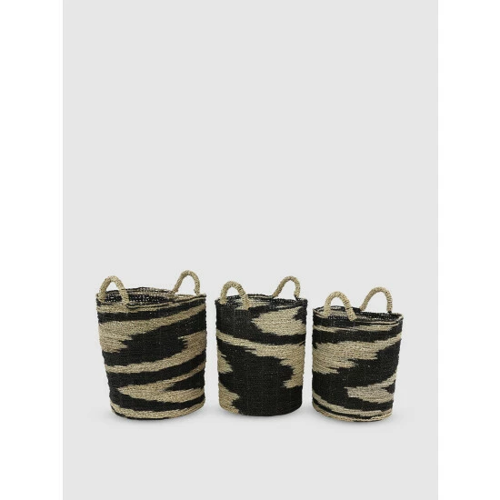Whimsical texture characterizes this set of tall, round, natural seagrass baskets. Use as tote bags, laundry baskets or simply as display baskets to accompany your coastal or eclectic decor. These versatile baskets will bring lively style anywhere you put them. The swirling colors make a bold design statement, while the natural rattan handles impart an earthy vibe. The bucket shape, coupled with the corded looped handles, add more dimension and boho style to any space. The deep bucket shapes offer ample storage. Suitable for indoor use only.