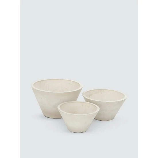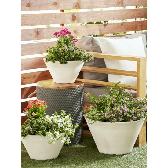 Simple yet stylish, this set of 3 large ceramic plant pots are crafted from weather-resistant fiber clay with a textured finish. Each slightly tapers at the base, creating a wide bowl shape to accommodate a larger plant or multiple succulents or cacti. The planters’ neutral clay finish will work with any color palette. Dress up contemporary spaces using this set of versatile and durable accent pieces that are ideal for indoor and outdoor use. Display them together or separately.
